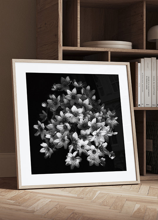 Yvette Depaepen Early Sensation on runollinen, mustavalkoinen muotokuva kukkivasta klematiksesta. Syvää, samettisen tummaa taustaa vasten esiin tulevat kirkkaat terälehdet veistoksellisilla kaarevilla ja hienoilla suonilla, jotka paljastavat kukkien hiljaisen draaman. Hienostunut kasvitieteellinen asetelma rauhallisella, kontrastilla ja ajattomalla eleganssilla. Perustettu Bruggessa, Belgiassa.