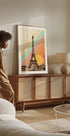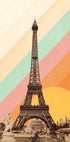 Silmiinpistävä retro-vaikutteinen kuva Pariisin Eiffel-tornista rohkeaa sateenkaariraidallista taustaa vasten ja lämmin kultainen aurinko. Vintage-valokuvauksen ja eloisan graafisen suunnittelun yhdistelmä luo nostalgisen mutta modernin matkailuvaikutteisen taideteoksen, joka sopii täydellisesti Pariisin, arkkitehtuurin ja värikkään seinän sisustuksen ystäville.