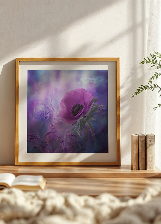 Natalia Simongulashvilin (NATALIORION) Ekstaasi vangitsee unenomaisen kasvitieteellisen hetken: pehmeät violetit kukat ja hienot ruohonkorvat nousevat esiin samettisessa valossa, jota kehystää huomaamaton vinjetti. Rauhallinen kukkakuvaus, joka luo upotusta, runoutta ja ripauksen puutarhataikaa huoneeseen. Luo leijuvan, runollisen rauhan kotiin.