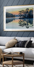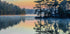 Rauhallinen järvimaisema aamunkoitteessa, kuvattu Ruotsissa, kun sumu nousee tyynellä vedellä. Mäntyjen heijastus hehkuu pehmeässä auringonvalossa ja luo rauhallisen ja meditatiivisen ilmapiirin, joka on täynnä rauhaa ja harmoniaa.