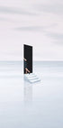 Surrealistinen käsitteellinen taideteos, joka kuvaa henkilöä astumassa pimeästä ovesta rauhallisten, heijastavien vesien yli. Minimalistinen järjestely, jossa portaat vievät tyhjyyteen, herättää teemoja, kuten pako, lähtö ja uusi alku. Kohtaus sekoittaa unenomaista surrealismia vuosisadan puolivälin inspiroimaan estetiikkaan.