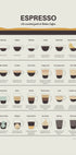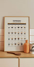 Yksityiskohtainen espressojuliste, jossa on kuvitettu yleiskatsaus klassisista italialaisista kahvijuomista. Espressosta ja doppiosta cappuccinoon, latteen ja affogatoon – tämä keittiöjuliste on sekä opettavainen että tyylikäs. Täydellinen seinätaide kahviloihin, kahviloihin ja kotikeittiöihin.