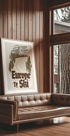Vintage kunnianosoitus alppimatkoille: lumihuippuiset huiput kohoavat tummien mäntymetsien yläpuolelle, kun taas punainen köysirata liukuu rinteen yli. Retrotypografia kutsuu Euroopan ikonisiin hiihtokeskuksiin – Chamonixista ja muualta. Mykistetty vihreä ja ruskea sävy kohtaa terävän talven valkoisen ja herättää puhtaan matkakuumeen. Täydellinen talviunelmiin.