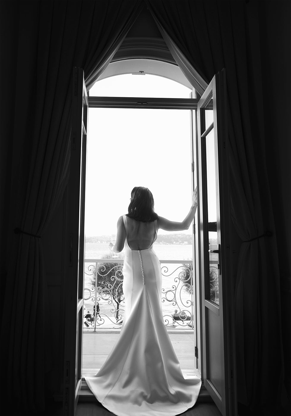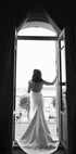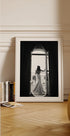 Upea mustavalkoinen valokuva, joka vangitsee naisen eleganssia levenevässä mekossa katselemassa parvekkeelta. Koostumus korostaa ajatonta graceutta, hienostunutta tyyliä ja rauhallista kauneutta, mikä tekee siitä täydellisen taideteoksen sisustukseen, jossa juhlitaan muotia, romantiikkaa ja hienostuneisuutta.
