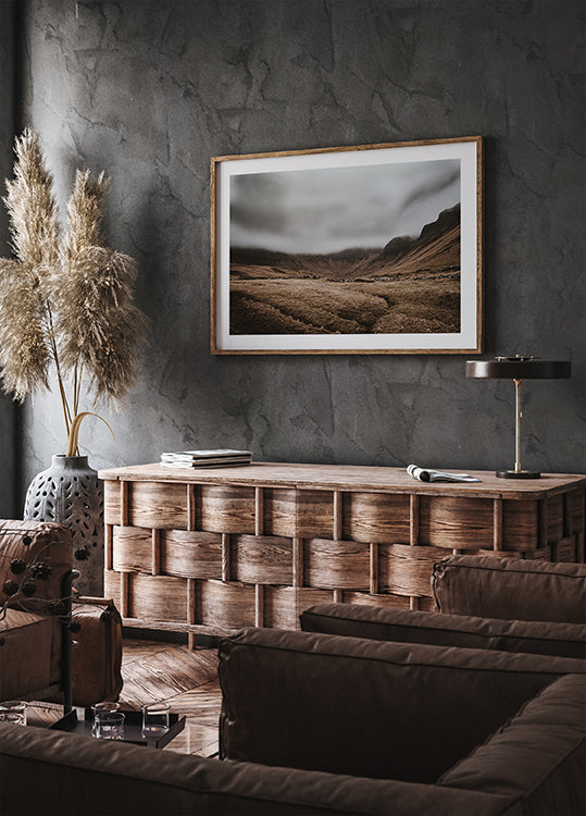 Dramaattinen maisema Färsaarilla, jossa on jykeviä kukkuloita ja laaja ruoholaakso paksun, matalalla roikkuvan pilvipeitteen alla. Vaimeat sävyt ja raaka kauneus herättävät eristäytyneisyyden ja koskemattoman erämaan tunteen, mikä sopii täydellisesti teemoihin, kuten luonnon loistoon ja etäiseen rauhaan.