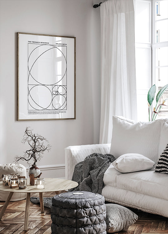 Minimalistinen matematiikkajuliste, joka havainnollistaa Fibonaccin lukujonoa ja kultaista leikkausta. Tämä elegantti design esittelee luonnossa, taiteessa ja arkkitehtuurissa esiintyvää geometrista suhdetta. Täydellinen matematiikan ystäville, opiskelijoille ja moderniin sisustukseen.