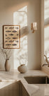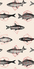 Modernin taiteen juliste, jossa on yksityiskohtaiset kalakuvitukset yhdistettynä geometrisiin punaisiin muotoihin. Toisto ja symmetria luovat ainutlaatuisen kuvion, joka yhdistää luonnon ja abstraktin geometrian, mikä tekee tästä upean modernin seinätaiteen.
