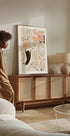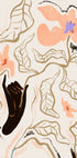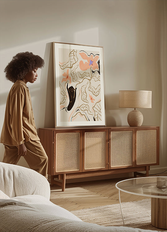 Moderni abstrakti taideteos käsin piirretyillä kukilla lämpimin persikan ja aprikoosin sävyin. Kuvannomainen musta käsi luo kontrastia ja syvyyttä sekä muodostaa runollisen yhteyden ihmisen ja luonnon välille. Tämä ilmeikäs kasvitieteellinen aihe yhdistää modernin maalaistyylin taiteelliseen minimalismiin, joka on ihanteellinen seinätaiteena.