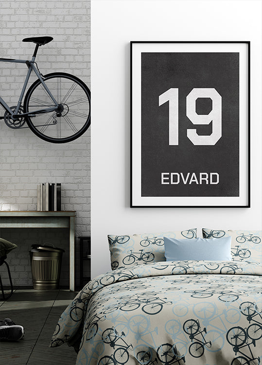 Tämä sporttinen ja persoonallinen juliste esittää jalkapallopelin numeroa ja nimeä tyylikkäässä ja modernissa designissa. Loistava lahjaidea nuorille jalkapallofaneille tai seinätaide pojan huoneeseen.