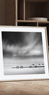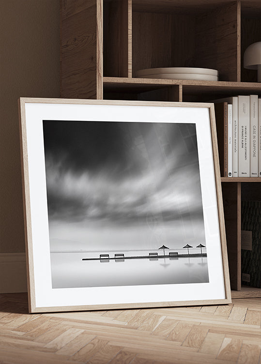 George Digalakiksen neljä penkkiä ja kolme sateenvarjoa vangitsevat mustavalkoisen rannikkomaiseman rauhallisuutta: neljä penkkiä ja kolme sateenvarjoa seisovat tarkassa rytmissä hiljaisella laiturilla. Puhdas koostumus, pehmeät harmaan sävyt ja suuret negatiiviset pinnat luovat tasapainon, heijastuksen ja ajattoman, meditatiivisen hiljaisuuden tunteen.