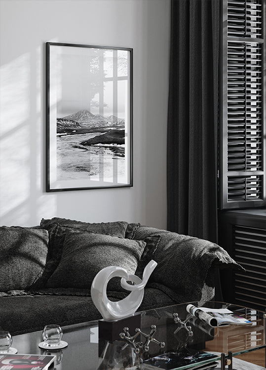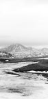 Lynann Colliganin graafinen mustavalkoinen maisema: jäätynyt Islannin joki kiertelee tundran halki kohti kaukaisia vuoria laajan, tyyni taivaan alla. Kontrastit jään halkeamien ja lumen pehmeiden pintojen välillä luovat syvyyttä ja rauhallisuutta pohjoismaisen minimalismin ja raa'an talvirunouden kanssa. Ajaton, yksivärinen katsaus luonnon voimaan.