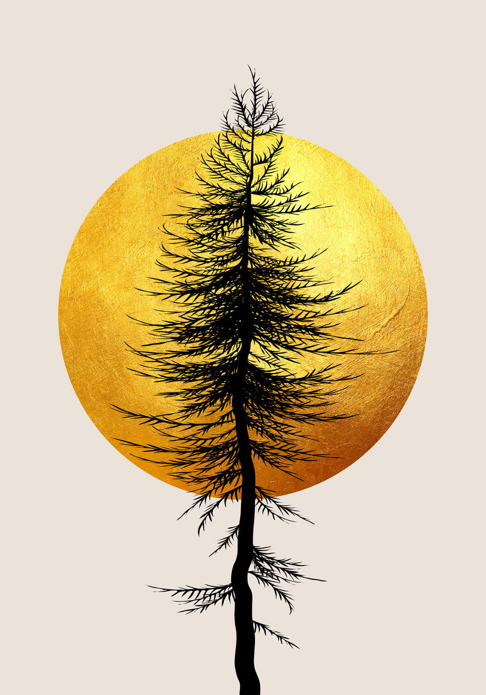Silmiinpistävä minimalistinen sommitelma, jossa musta puu kuvastui loistavaa kultaista aurinkoa vasten. Kuvioitu kultainen tausta luo kauniin kontrastin herkille oksille ja luo modernia ja luonnon inspiroimaa estetiikkaa. Täydellinen elegantin yksinkertaisuuden, skandinaavisen sisustuksen ja modernin muotoilun ystäville.