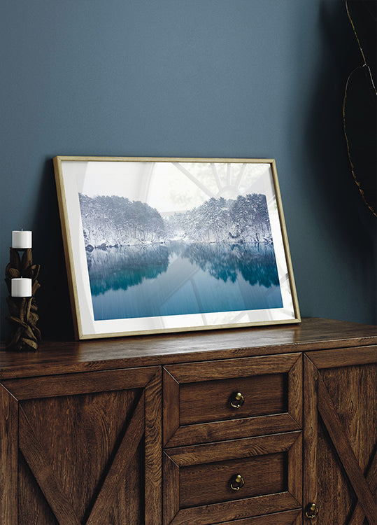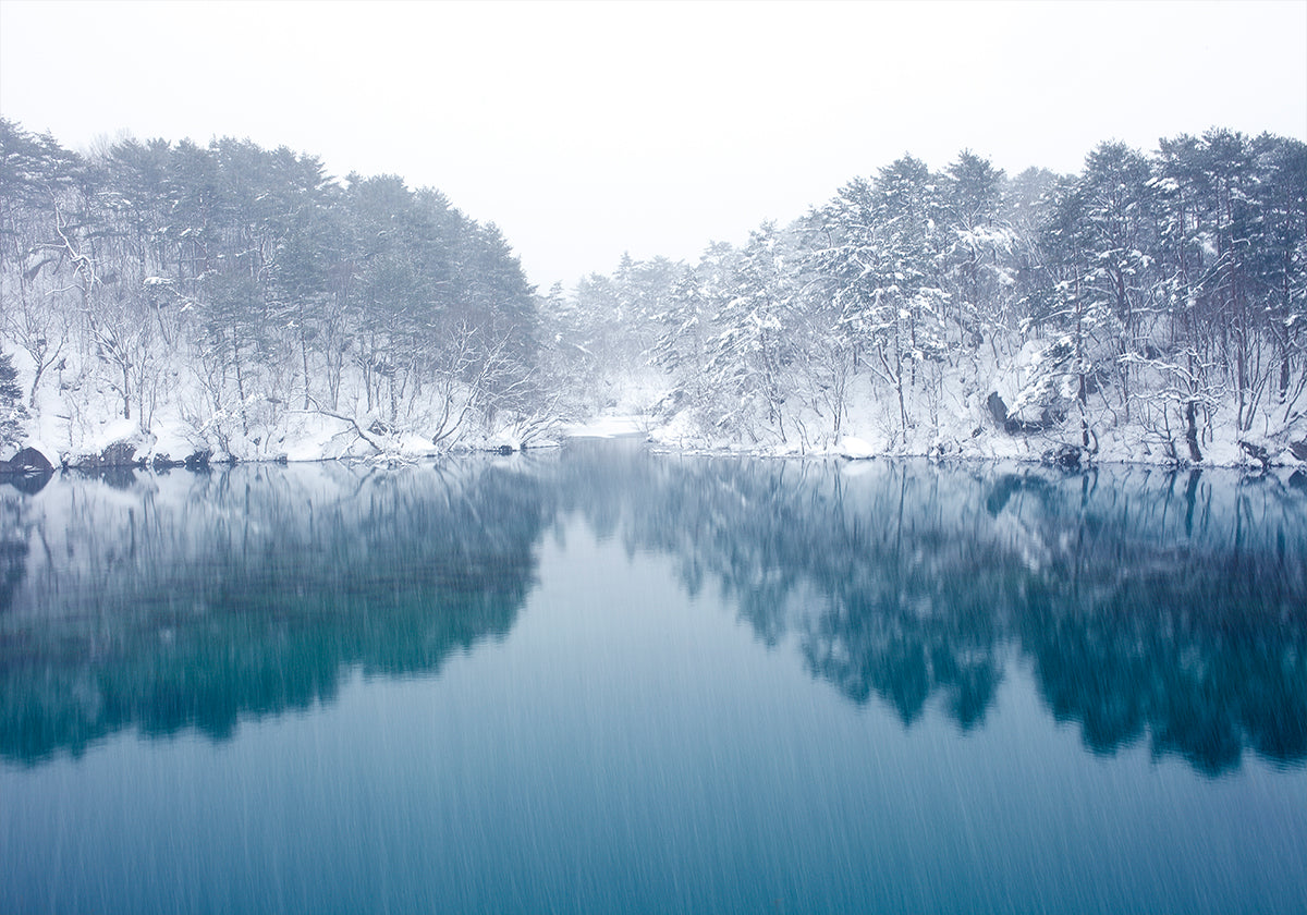 Hiljainen talvihetki Goshiki-numassa Urabandaissa: sumu leijuu jäätyneen järven yllä, kuusien siluetit heijastuvat jäiseen veteen ja hieno lumikerros vaimentaa kaiken äänen. Sasaki Makoto vangitsee luonnon runollisen tyyneyden ja mietiskelyyn kutsuvat siniharmaat sävyt. Hiljainen kumppani kodin hiljaisimpiin kolkoihin.