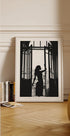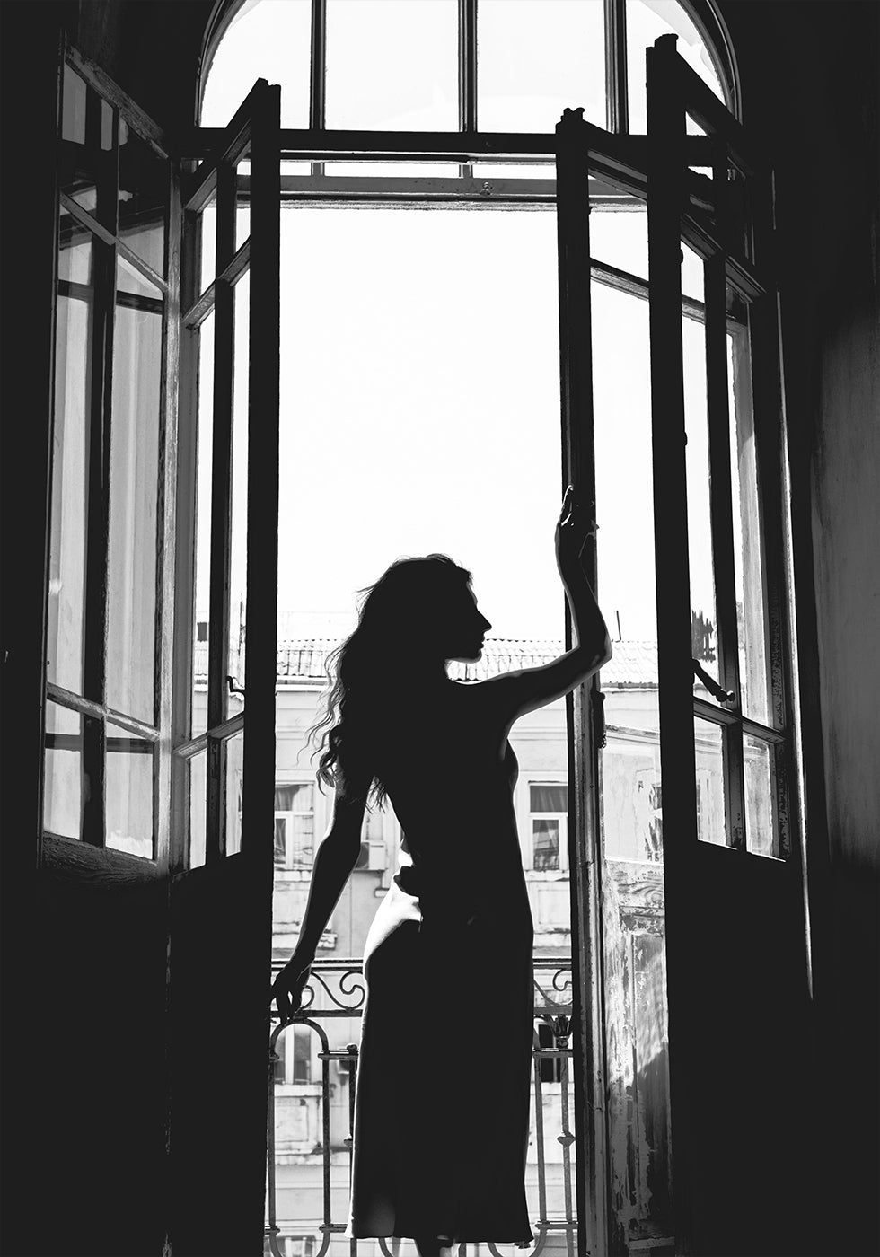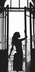 Parvekkeen oven vieressä seisovan naisen silmiinpistävä mustavalkoinen siluetti huokuu eleganssia ja tyyneyttä. Valon ja varjon leikki luo ajattoman tunnelman, mikä tekee tästä taideteoksesta houkuttelevan ilmeen sisustuksiin, jotka ovat saaneet vaikutteita hienostuneisuudesta, naisellisuudesta ja modernista romantiikasta.