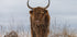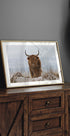 Majesteettinen skotlantilainen ylämaalainen seisoo rauhallisesti lumisessa maisemassa, sen pitkä, ruskea turkki, joka on pölyttyneenä vanteella ja sen sarvet kaartuvat valkoista horisonttia vasten. Mykistetty talvipaletti ja sumuinen kylmä luovat pohjoismaista rauhallista ja maalaisrunoutta. Kuvan on ottanut Jaap van den Helm. Nauhoitettu Veluwezoomissa, Alankomaissa ja ihanteellinen pohjoismaiseen maalaismaiseen sisustukseen.