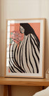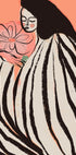 Unenomainen ja runollinen juliste, jossa on tyylitelty muotokuva naisesta, joka on ympäröity silmiinpistävän mustavalkoisen raidan kanssa ja pitelee kevyesti kukkaa. Pehmeällä persikkataustalla ja ilmeikkäillä linjoilla taideteoksessa yhdistyvät romantiikka, naisellisuus ja moderni kuvitus koristeelliseksi ilmeeksi, joka on täynnä tunnetta ja charmia.