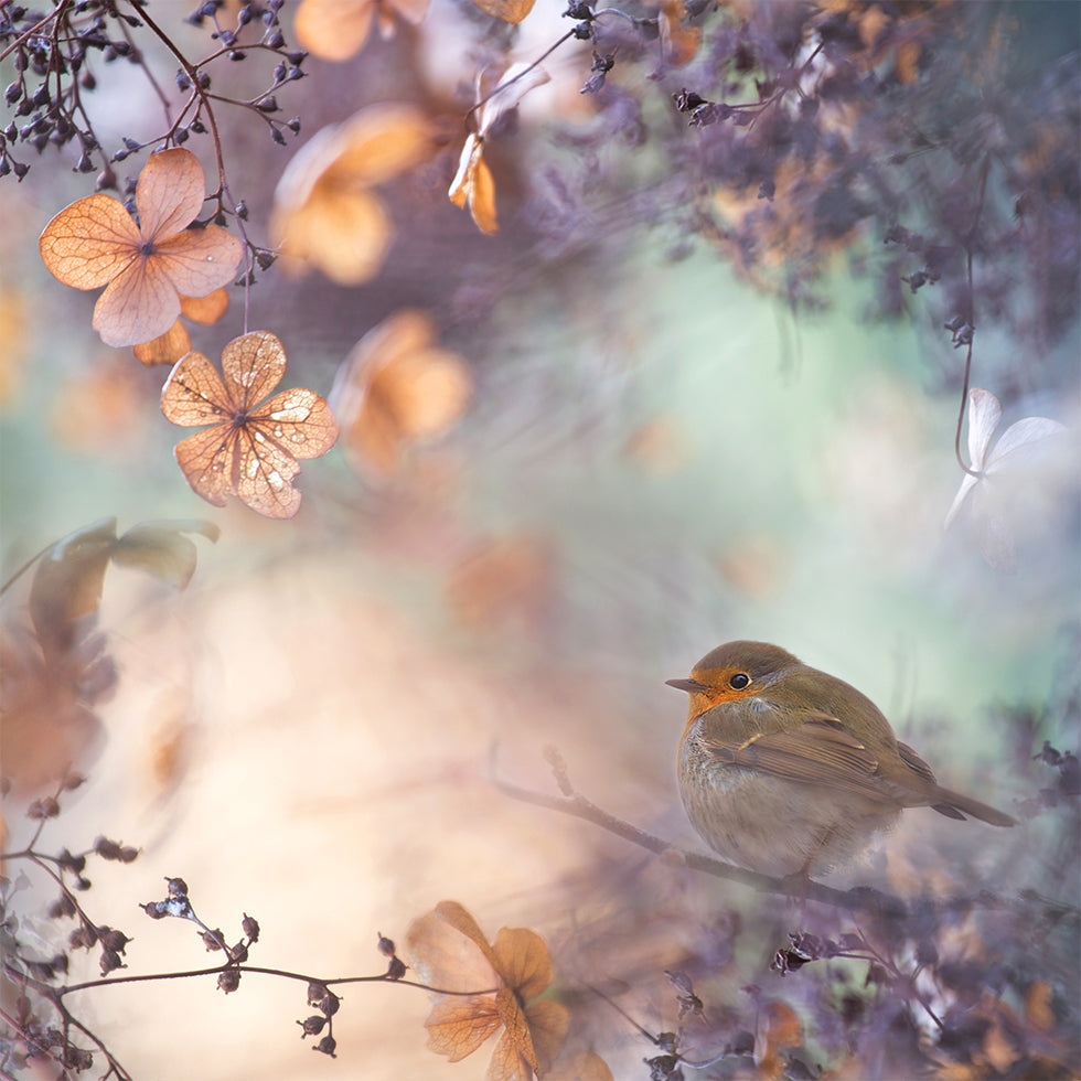 Teunin Hortensia-fantasia kuvaa pientä punapäätä huurteisten hortensioiden joukossa, jotka kylpevät pehmeässä bokehissa ja kevyessä lumessa. Pastellivärit ja pehmeä valo antavat aiheelle unenomaisen, seikkailunhaluisen auran, jossa luonnon runous kohtaa talven hiljaisen taian ja kutsuu sisälle rauhaa. Runollinen katseenvangitsija kasvitieteellisille sieluille.