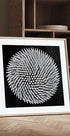 Giorgio Toniolon hypnoosi on yksivärinen, graafinen sommitelma, jossa samankeskiset ympyrät ja renkaat muodostavat symmetrisen, lähes pallomaisen kuvion vahvalla kontrastilla. Fibonaccin inspiroimat mittasuhteet ja tiukka geometria luovat hypnoottisen syvyyden ja rauhallisen, minimalistisen optisen pulssin. Graafinen pallo tasapainoilee järjestyksen ja illuusion välillä.
