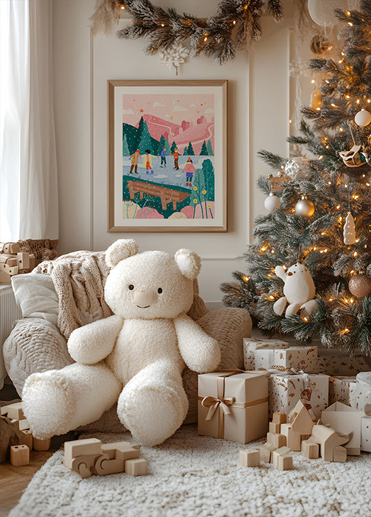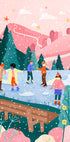 Bea Müllerin leikkisä talviaihe: jäällä järvellä lapset ja aikuiset luistelevat koristellun joulukuusen ympärillä lumihiutaleiden tanssiessa ilmassa. Taustalla näkyvät pehmeät vuoret ja tumma kuusi, jotka kehystävät juhlatunnelmaa. Värit ovat lämpimiä ja eloisia, täynnä talvista taikuutta. Kunnianosoitus perheelle, yhteisölle ja kauden ilolle.