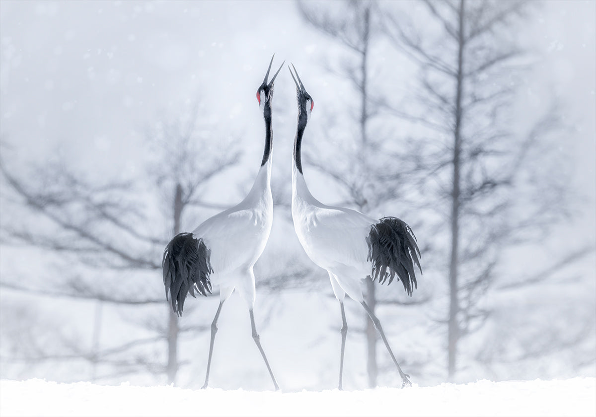 In love af Larry Deng APA viser et par traner i en frostklar, snedækket stilhed. Deres yndefulde dans og buede halse tegner et diskret hjerte, mens dæmpede vintertoner og let tågedis skaber ro, poesi og romantik – et nordisk blikfang til stue eller soveværelse. En smuk gave til bryllup, årsdage og Valentinsdag.
