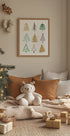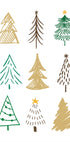 Moderni minimalistinen kuvitus, jossa on kokoelma abstrakteja joulukuusimalleja vihreänä, kullana ja ruskeana. Jokaisella puulla on ainutlaatuinen käsin piirretty tyyli, joka sopii täydellisesti joulukoristeisiin ja juhlavaan seinätaideeseen.