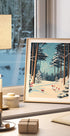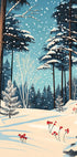 Rauhallinen talvikuva lumisesta metsästä, jossa on korkeita mäntyjä ja putoavia lumihiutaleita. Punaiset marjat tuovat rauhallista maisemaa juhlavaa tunnelmaa, jotka sopivat täydellisesti joulu- ja talvikoristeisiin.