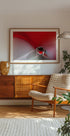 Silmäänpistävä makro-abstrakti taideteos, jossa on herkkä vesipisara pehmeän punaisen ja neutraalin sävyjä vastaan. Lähikuva luo intiimin ja eleganssin tunteen, mikä tekee siitä täydellisen ilmeen moderneihin sisätiloihin.