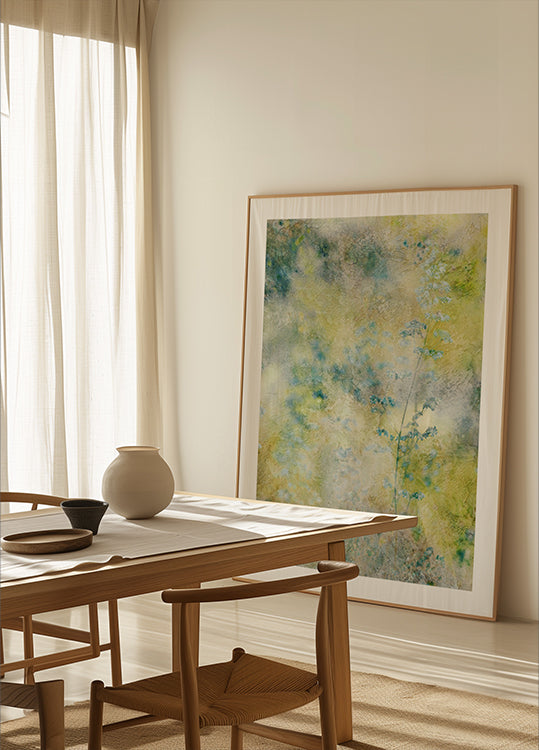 Herkkä impressionistinen taideteos, jossa kasvitieteelliset muodot yhdistyvät pehmeisiin maalauksellisiin tekstuureihin. Herkät vihreän, sinisen ja kullankeltaisen sävyt luovat unenomaisen ja rauhallisen tunnelman, joka vangitsee luonnon ohikiitävän kauneuden. Täydellinen lisäämään rauhoittavaa ja taiteellista tunnelmaa mihin tahansa huoneeseen