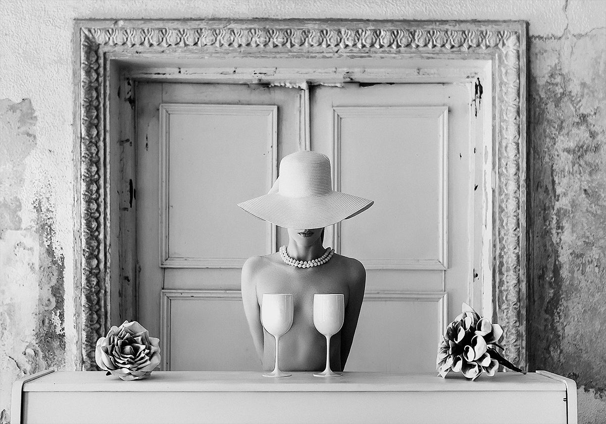 Valkoinen ruoka: Motiivi on painettu valkoisella, mattareunuksella kuvion ympärillä. Tämä antaa puhtaan ja tyylikkään ilmeen, joka korostaa aihetta ja antaa galleriahenkisen ilmeen.