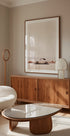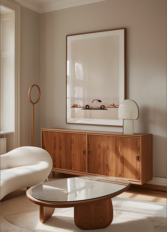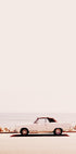 Minimalistinen ja nostalginen valokuva vanhasta avoautosta, joka on pysäköity meren rannalla. Tämä taideteos vangitsee Kalifornian rannikon olemuksen ja herättää muistoja retkistä, kesäpäivistä ja ajattomasta retro-ihanasta.
