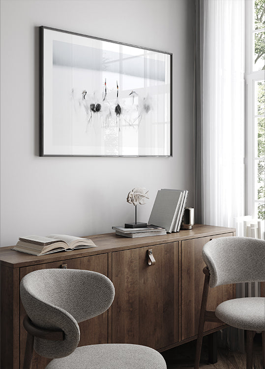 Kahden punaisen kurkun siro tanssi kohoaa lumen peittämän maiseman halki Larry Deng APA:n kirkkaalla kalligrafisella ilmeellä. Pehmeät, mustetta muistuttavat vedot ja minimalistinen tila luovat tyyneyttä, liikettä ja runoutta – kuin talvituulta paperille – hiljaisen kunnianosoituksen japanilaiselle eleganssille ja luonnon rytmille. Runollinen ilme tilaan.