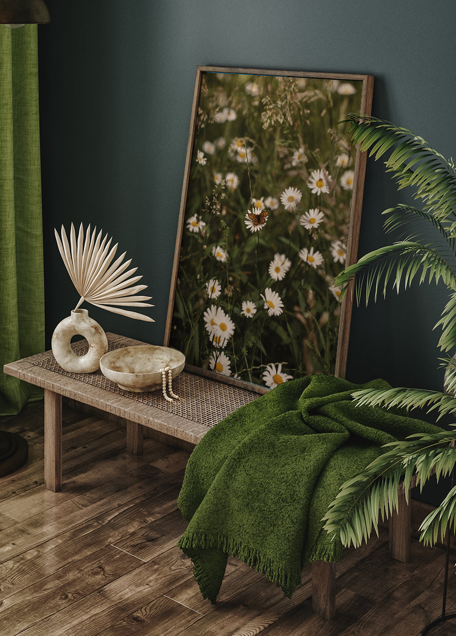Herkkä ja moderni juliste, jossa on kamomillankukkia ja perhosia. Täydellinen luomaan rauhoittavaa ja luonnollista tunnelmaa mihin tahansa huoneeseen, niin kotiin kuin toimistoonkin.
