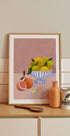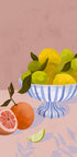 Viehättävä asetelmakuva raidallisesta kulhosta, joka on täytetty sitruunalla ja limetillä, ja mukana viipaloitu veriappelsiini ja limettiviipale. Lämpimin sävyin ja maalauksellisilla tekstuureilla tämä taideteos tuo raikkaan, Välimeren inspiroiman tunnelman, joka sopii täydellisesti keittiöön tai ruokasaliin.