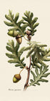 Yksityiskohtainen kasvitieteellinen kuva Quercus pyrenaica (Pyreneen tammi), jossa on tammenterhoja ja hienojakoisia lehtiä klassisessa vintage-tyylissä. Tämä tyylikäs lankku osoittaa kunnioitusta luonnonhistorialle ja lisää ajatonta charmia sisustukseen. Täydellinen kasvitieteilijöille, metsän ystäville ja perinteiselle kuvitukselle.