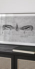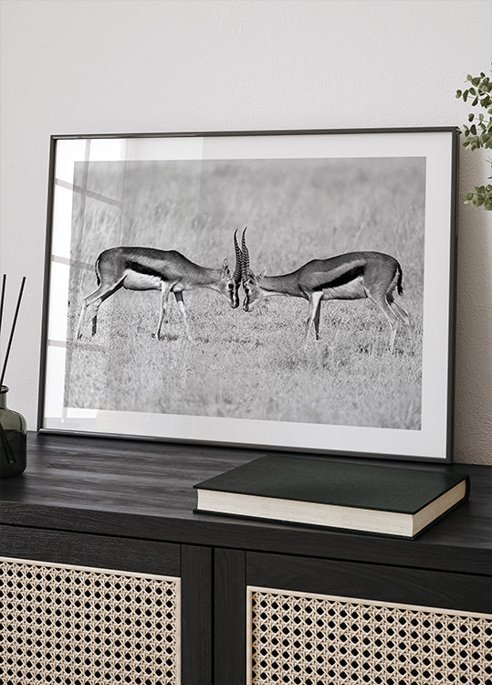 Voimakas mustavalkoinen eläinvalokuva kahdesta gasellista, jotka kohtaavat kaksintaistelussa sarvet kohtaamassa voimia ja haasteita. Tämä valtavalla Serengetin savannilla kuvattu kuva välittää raakaa energiaa, selviytymistä ja erämaan ajatonta henkeä.