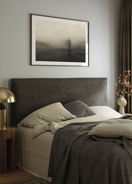 Runollinen ja häiritsevä aihe mieshahmosta, joka hitaasti katoaa utuiseen horisonttiin. Kuva tasapainoilee todellisen ja unenomaisen välillä herättäen kysymyksiä identiteetistä ja ajasta.