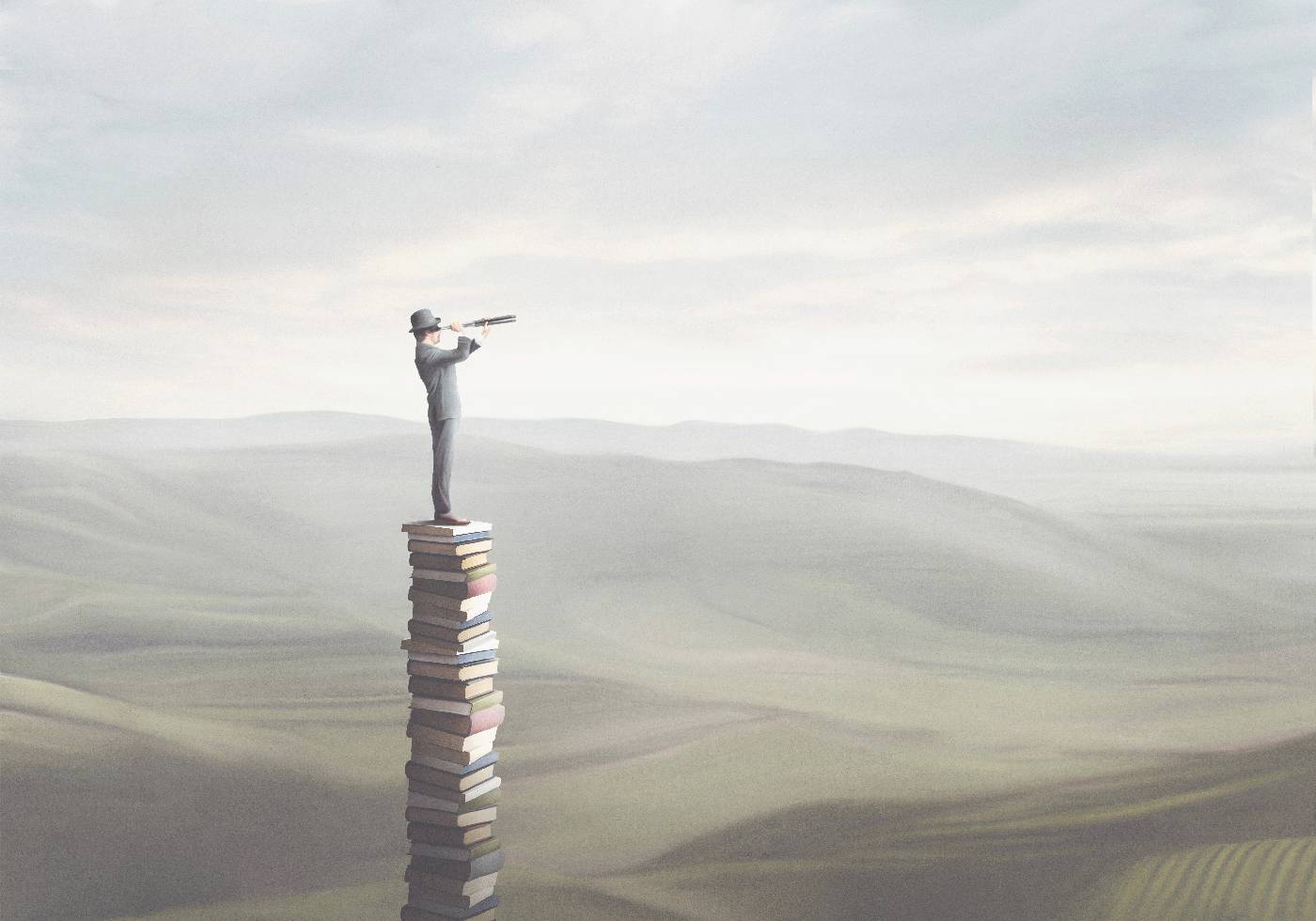 The Tower of Books -juliste* on inspiroiva surrealistinen kuvitus, joka symboloi tietoa, oppimista ja uusia näkökulmia. Pukupukuinen mies seisoo korkealla kirjapinolla ja katsoo kiikarin läpi – kaunis vertauskuva siitä, kuinka koulutus ja viisaus avaavat näköaloja. Täydellinen kirjastoihin, toimistoihin, luokkahuoneisiin tai henkilökohtaista kehitystä ja älyllistä tutkimusta rakastaville.