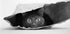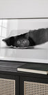 Humoristinen mustavalkoinen valokuva uteliaasta kissasta kurkistamassa ulos paperipussista leveillä, yllättyneillä silmillä. Leikkisä ilme ja minimalistinen asetelma tekevät tästä viehättävän ja hauskan kuvan kissan ystäville.