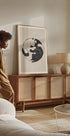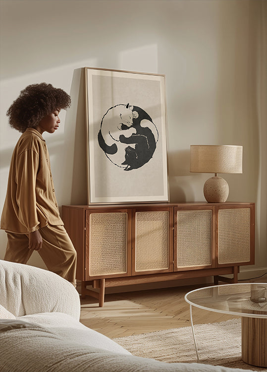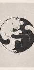 Minimalistinen mustavalkoinen taidejuliste, jossa on kaksi kissaa, jotka makaavat yhdessä yin-yang-muodostelmassa ja symboloivat tasapainoa, rauhaa ja harmoniaa. Nykyaikainen kappale, joka sopii täydellisesti kissojen ystäville ja niille, jotka arvostavat rauhallista, modernia muotoilua.