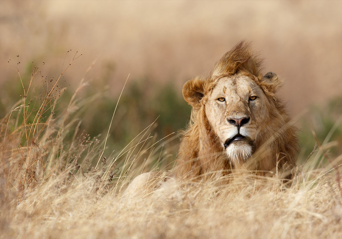 Majesteettinen leijona tuuli harjassaan katselee Serengetin savannille – raakaa voimaa ja tyyneyttä täydellisessä tasapainossa. Ali Khataw vangitsee hetken runollisen selkeästi, jossa pehmeä bokeh-ruoho ja kultainen valo antavat aiheeseen ajattoman, kuninkaallisen auran. Katseenvangitsija, joka tuo villin luonnon huoneeseen. Täydellinen pohjoismaiseen minimalismiin.