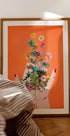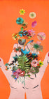 Eloisa ja mielikuvituksellinen taideteos, jossa kädet vapauttavat värikkäitä kukkia ja lehtiä vahvaa oranssia taustaa vasten. Digitaalinen kollaasi yhdistää luonnon ja figuratiivisen taiteen luoden katseenvangitsevan kukkakuvituksen, joka symboloi vapautta, luovuutta ja kauneutta.