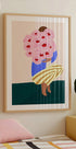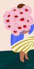 Moderni abstrakti kuva naisesta, jolla on suuri vaaleanpunainen kukkakimppu, maalattu vahvoilla ja eloisilla väreillä. Minimalististen muotojen, raidallisten housujen ja modernin muotoilunsa ansiosta tämä taideteos sopii täydellisesti tyylikkäisiin sisätiloihin. Leikkisä mutta tyylikäs seinäkoristelu.