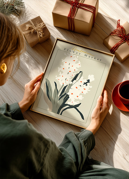 Graafinen kunnianosoitus Amsterdamille: tyylitelty hyasintti on markkina-ikoni, jota ympäröi rohkea typografia ja viileät pohjoismaiset sävyt. Juliste tasapainottaa talvisen rauhallisuuden ja kevään lupauksen. Annickin suunnittelema ja luotu antamaan kotiisi tuore kasvitieteellinen painopiste ja elegantti, moderni viehätys. Skandinaaviseen sävyyn.