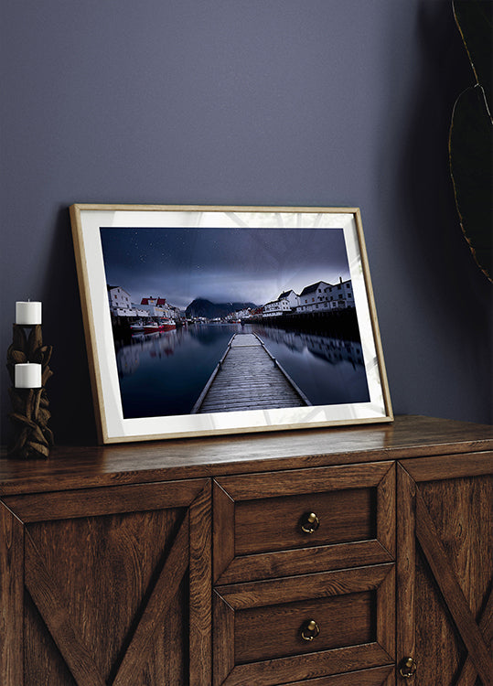 Kun yö laskeutuu Lofoottien Henningsværin ylle, puutalot ja kalastusalukset heijastuvat tyynessä vedessä, kun taas tähdet näkyvät vuoren yläpuolella. Lior Yaakobi vangitsee pohjoismaisen tyyneyden ja syvyyden dramaattisella perspektiiviviivalla sataman läpi, jossa laiturilta tuleva valo ohjaa katseen tummansinistä taivasta kohti. Hiljainen yö arktisessa valossa.