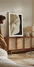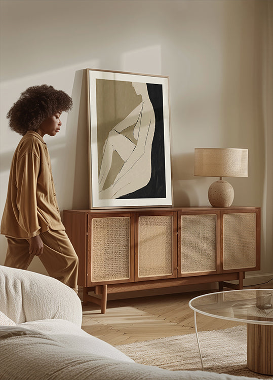 Rauhallinen ja minimalistinen abstrakti taideteos, joka esittää istuvan naisen muotoa mykistetyillä sävyillä. Maalauksellisilla siveltimenvedoilla ja modernilla yksinkertaisuudella teos ilmaisee rauhallisuutta ja rentoutumista, mikä on ihanteellinen moderniin sisustukseen ja taiteelliseen seinäkoristeeseen.