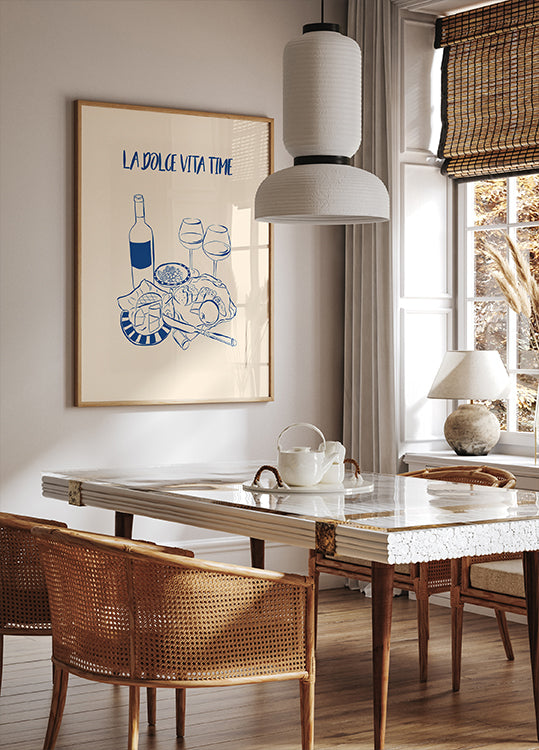 Yksinkertainen ja viihtyisä viivapiirrosjuliste, jossa on viiniä, juustoa, hedelmiä ja leipää - Välimeren inspiroima. Teksti "La Dolce Vita Time" kehystää hyvää elämää, rentoutumista ja italialaista charmia. Ihanteellinen keittiöön.