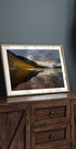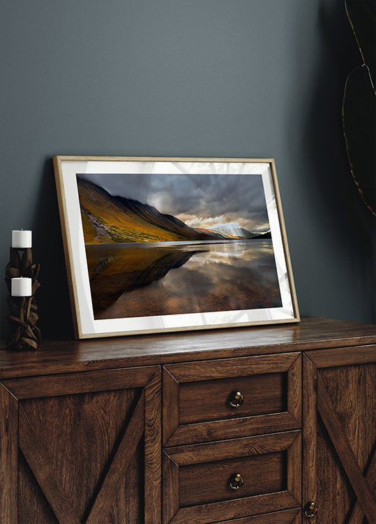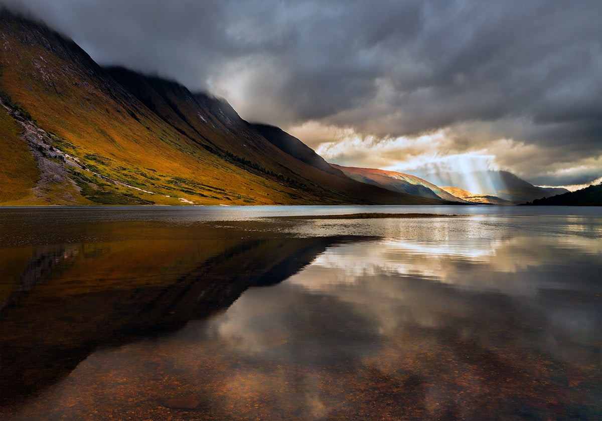 Upea maisemajuliste Glencoesta Skotlannista, jossa dramaattiset pilvet avautuvat ja auringonsäteet putoavat ylängöille ja järvelle. Rauhallinen vesi heijastaa karuja vuoria ja luo voimakkaan mutta rauhallisen sommitelman, joka vangitsee luonnon harmonian ja hiljaisuuden.
