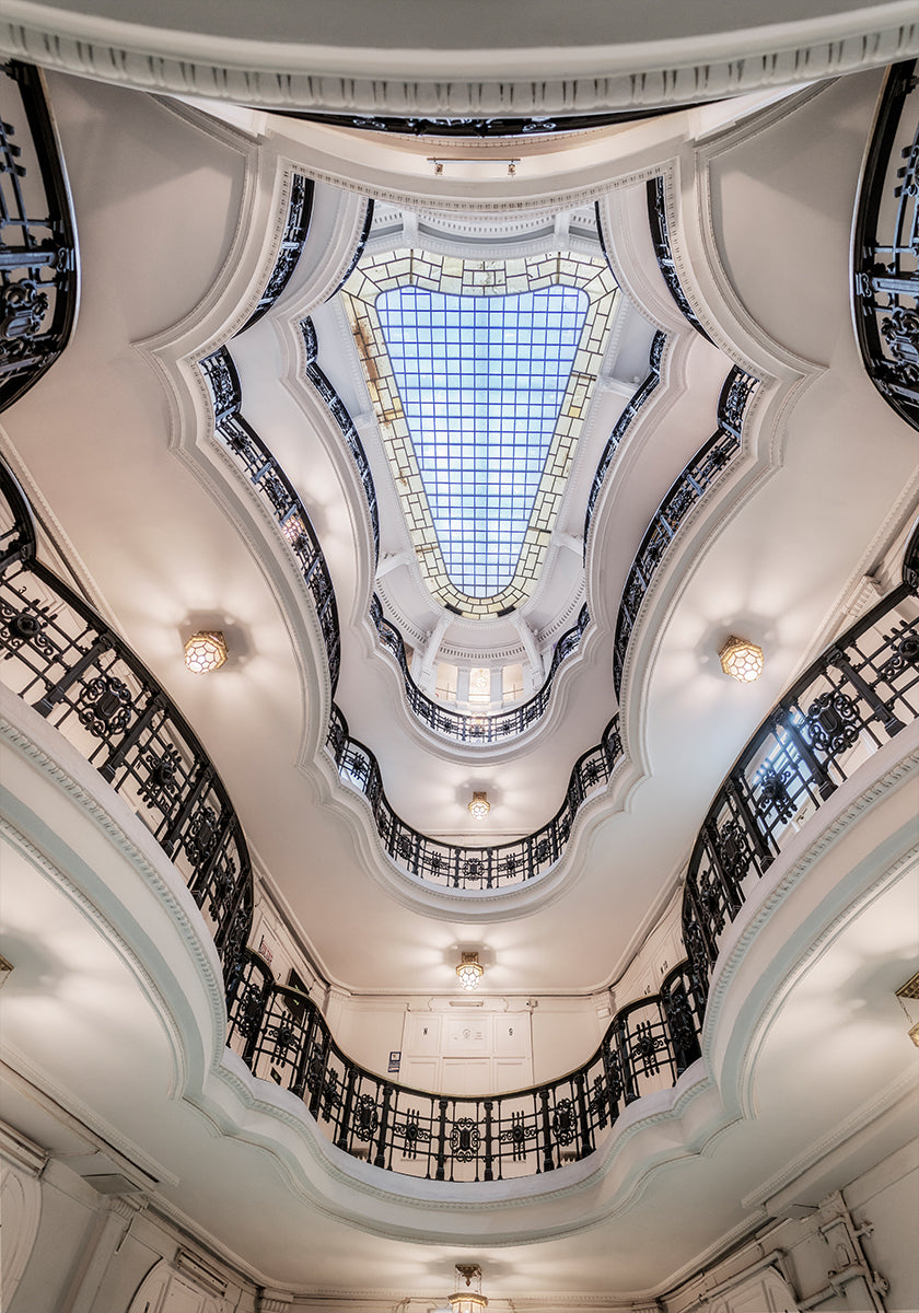 Valokuvaaja Jorge Ruiz Dueson vangitsema hypnoottinen katse ylös Madridin Casa Palazuelon ikonisten portaiden läpi. Kaarevat linjat ja toistuvat lattiat muodostavat graafisen kuvion, jossa valo ja varjot tanssivat. Urbaani kunnianosoitus arkkitehtuurin runoudelle, joka nostaa minkä tahansa seinän. Perspektiivi ohjaa katseen ylöspäin, muotojen ja syvyyden läpi ja antaa huoneelle rauhan.