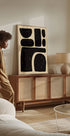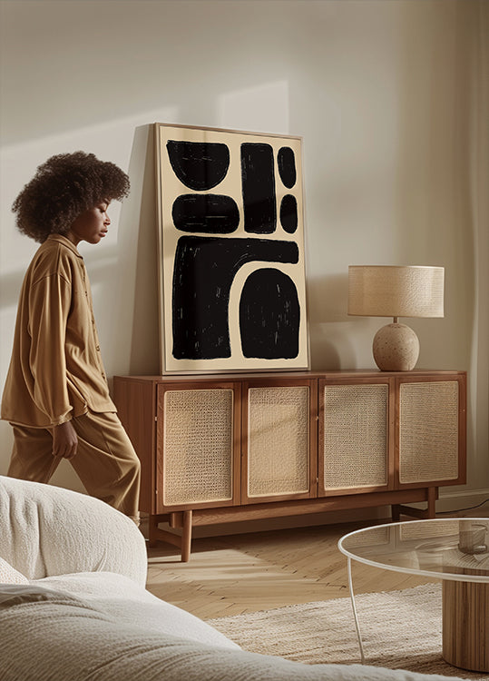 Silmiinpistävä abstrakti taideteos, jossa on rohkeita mustia muotoja pehmeällä beigellä taustalla. Orgaaniset muodot ja kuvioidut siveltimen vedot luovat modernin, minimalistisen estetiikan – täydellinen nykyaikaiseen sisustukseen, gallerian seiniin tai jokaiselle, joka rakastaa puhdasta mutta taiteellista muotoilua.