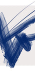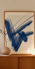 Moderni abstrakti taidejuliste vahvoilla sinisillä siveltimen vedoilla vaalealla taustalla. Dynaamiset vedot luovat liikettä ja tekstuuria, mikä tekee siitä silmiinpistävän minimalistisen teoksen, joka on täydellinen moderniin sisustukseen.